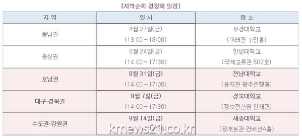 올 해 총 5회에 걸쳐 지역 순회로 개최되는 경청회는 동남권(4.27, 부경대), 충청권(8.24, 한밭대) 행사에 이어 세 번째로 호남권(8.31, 전남대)에서 개최되며, 다음 달 대구·경북권(9.7, 경북대)과 수도권·강원권(9.14, 세종대)에서도 개최된다.