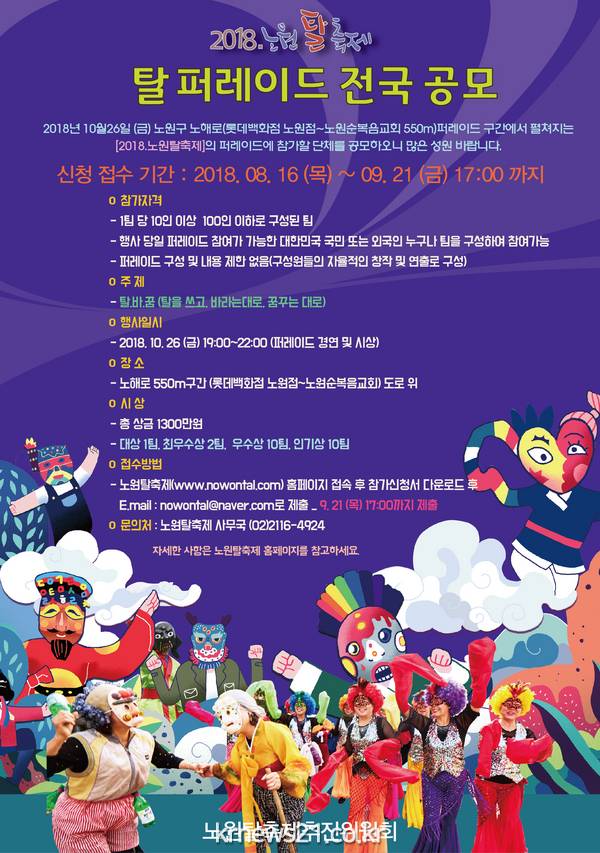 노원탈축제추진위원회 관계자는 “지역의 핵심 문화관광 프로그램이 되기 위해 새롭게 단장한 탈 퍼레이드에 많은 관심과 참여를 부탁한다”며 “퍼레이드 이후 벌어지는 화려한 경연대회와 흥겨운 대동 춤 한마당까지 지역주민 모두가 함께 즐기는 축제 한마당이 되기를 바란다”고 말했다.
