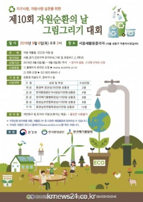 자원순환에 대한 이해를 높이고 그 중요성을 일깨우는 계기를 마련하고자 개최되는 이번 대회는 서울, 경기, 인천 지역 유치부(6~7세)와 초등부(1~3학년) 어린이들이 평소 떠올리던 자원 재활용에 대한 생각들을 도화지에 그려보게 된다.