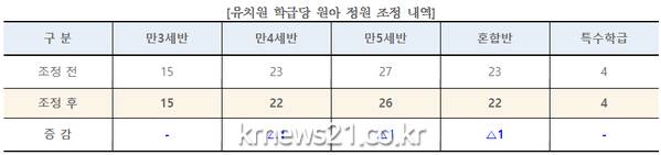 대전교육청은 유치원 학급당 원아 정원을 만4세반은 현재 23명에서 22명으로, 만5세반은 27명에서 26명으로, 3~5세 혼합반은 23명에서 22명으로 하향 조정했다. 만3세반과 특수학급은 현행 15명과 4명으로 변함이 없다.