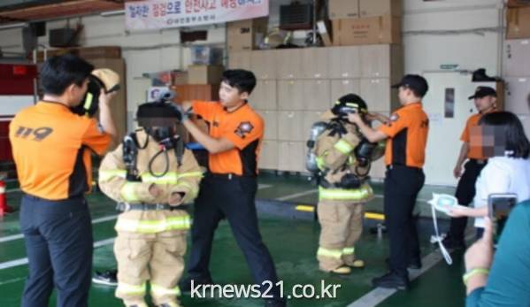 이 날 체험교실은 소방공무원 직업 소개와 채용과정, 심폐소생술 교육·체험, 구조장비 소개·체험, 방화복·공기호흡기 착용, 방수체험 등으로 진행됐다.