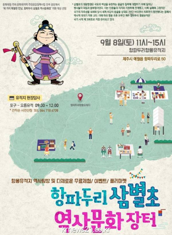 9월 역사문화장은 8일 항몽유적지 일원에서 ‘1273년 이후의 제주와 고려편’ 역사를 주제로 역사퀴즈와 유적지 답사, 나만의 감물들이기 체험과 어린이 활쏘기, 지역 농업인 등이 참여하는 주말 벼룩시장이 지속 열리고 있다.
