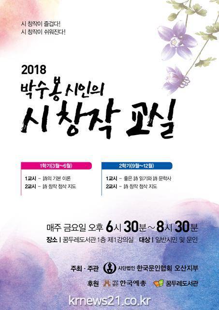 한국문인 협회 오산지부가 오는 7일부터 오산시 꿈두레 도서관에서 시민들을 대상으로 시 창작 교실 가을학기 수업을 시작한다.