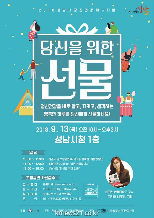 성남시(시장 은수미)는 오는 9월 13일 오전 10시~오후 3시 시청 온누리 홀과 로비에서 정신건강 축제를 연다.