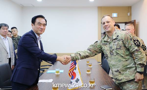 정장선 평택시장은 지난 7일 대외협력 실에서 미2사단/한미연합사단 맥킨 사단장과 한미 협력관계 강화를 위한 간담회를 가졌다.