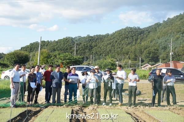 직원들은 친환경소득향상 2모작 작목전환 기반조성사업으로 추진한 당근농장 (강하면 오수길 농가)에서 업무연찬을 이어갔다.농업기술센터가 이모작작부체계를 7개유형으로 모델화하여 2017년 120ha에서 2018년 150ha까지 면적을 확대하여 농가소득향상을 도모하고 있다는 영농기술상담소장의 설명을 시작으로 올해는 기상이변에 대처할 수 있는 유공필름과 씨붙임 테이프를 활용한 파종방법 개선, 폭염대비 저압포그관수로 7월~8월에 발아하여 생육중인 당근의 재배기술 교육을 실시했다.