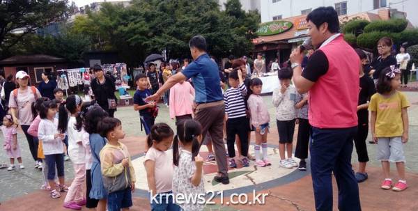 △지난 8일 9월 여문공원 벼룩시장 현장을 찾은 많은 어린이들이 프로그램 참여를 위해 줄을 서고 있다. 문수동 주민자치위원회는 동민들이 사용하지 않는 물건을 자유롭게 사고 팔 수 있도록 매월 둘째 주 토요일 벼룩시장을 운영하고 있다.