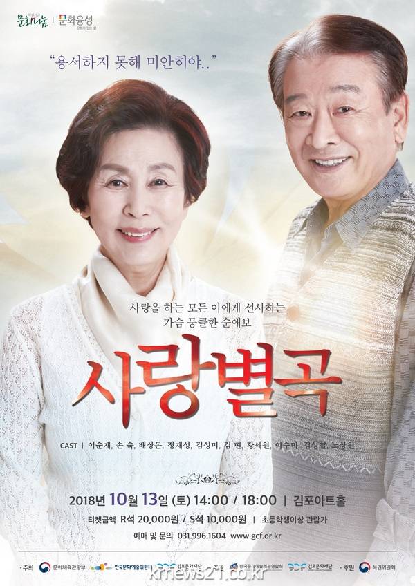 (재)김포문화재단(대표이사 최해왕)은 오는 10월 13일 김포아트홀에서 이순재, 손숙 주연의 연극 <사랑별곡>을 공연한다.