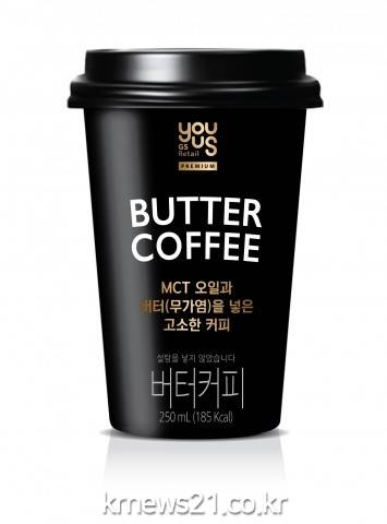 버터커피는 최근 전세계적으로 다이어트 커피 열풍을 불러 일으키며 홈트족, 다이어트족들 사이에서 이미 유명한 홈메이드 버터커피 레시피를 활용해 GS25가 국내 최초로 출시한 상품이다. GS25가 출시한 버터커피에는 무가염 버터와 MCT(Medium Chain Triglyceride)오일이 첨가됐다. MCT오일은 코코넛에서 추출한 중쇄 지방산 오일로, 체지방으로 축적되기 전에 열량으로 전환되는 속도가 빨라 단시간에 신체에 에너지를 공급해 다이어트에 많이 활용된다. 버터커피는 예가체프 원두 블랜딩을 기본으로 하며 고소한 버터향와 진한 카카오의 풍미를 느낄 수 있다.