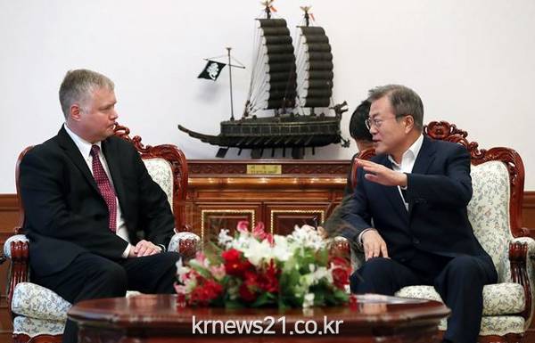 ▲ (사진=청와대)문재인 대통령은 11일 방한 중인 스티븐 비건 미국 국무부 대북특별대표를 접견하고 한반도 비핵화 및 평화체제 구축과 관련한 의견을 교환했다고 청와대가 밝혔다.
