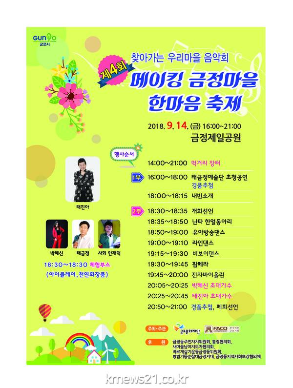 군포시 금정동은 오는 14일 금정제일공원 내 야외무대에서 주민 화합 및 살기좋은 마을 조성을 위해 ‘제4회 메이킹 금정마을 한마음 축제’를 개최한다.