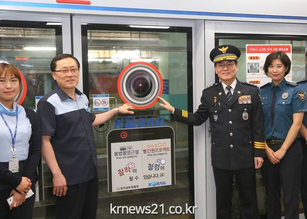 이날 경기남부경찰과 코레일은 수원역을 포함 도내 7개 역 승강장 스크린 도어에 대형 빨간원을 부착 지하철 이용 승객을 대상으로 불법촬영 범죄 근절 홍보를 진행했다.