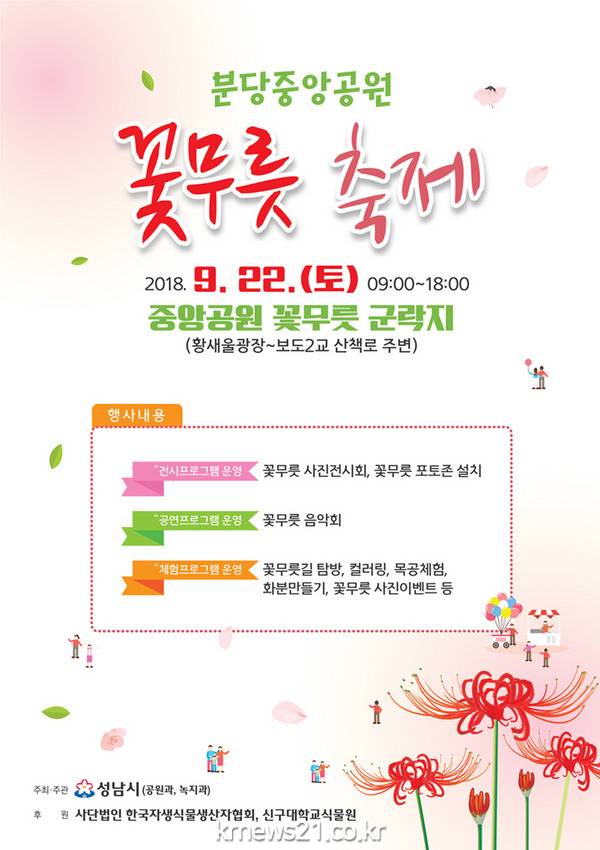 성남시(시장 은수미)는 오는 9월 22일 오전 9시~오후 6시 분당구 수내동 중앙공원에서 ‘꽃무릇 축제’를 연다.