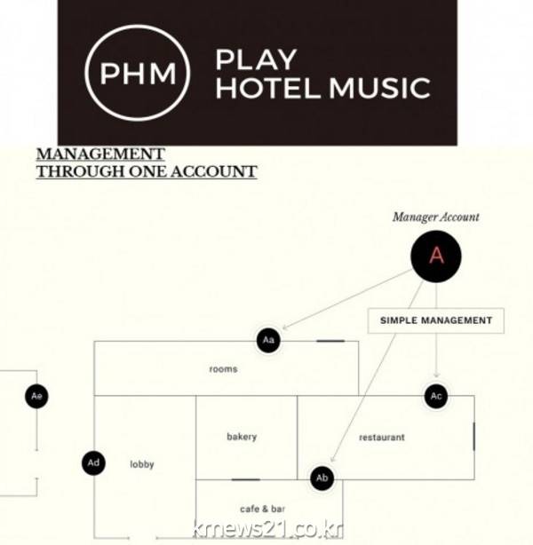 ‘PlayHotelMusic(이하 PHM)’은 글로벌 호텔들을 위한 전문화된 호텔 전용 매장음악 서비스다. PHM은 넷플릭스 시스템을 벤치마킹해 하나의 아이디로 호텔 내 최대 9개의 장소에서 동시에 재생이 가능하도록 설계됐다. 뿐만 아니라 관리자 아이디로는 각 호텔의 업장에서 재생하는 음악을 한번에 컨트롤 가능하도록 개발됐다. 음악적으로는 20개의 장소에서 144개의 채널을 사용할 수 있도록 준비했고, 호텔 내방객의 반응이 좋지 않은 곡은 자동삭제 되도록 AI시스템을 탑재했다.