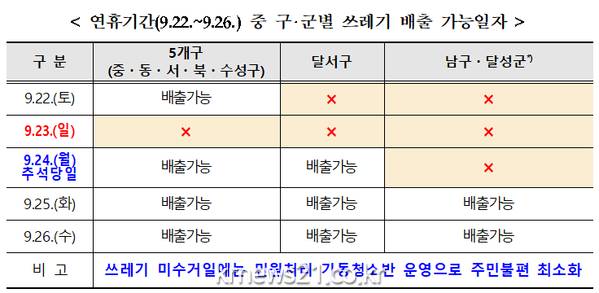 특히, 이번 추석 연휴기간 중 추석 당일 및 일부 구․군에서는 9.23.(남구, 달서구, 달성군), 9.25.(남구, 달성군) 쓰레기를 수거하지 않으므로, 주민들의 적극적인 협조가 당부된다.