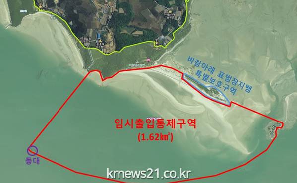 출입금지 구역은 바람아래 해변 일대 갯벌 1.62㎢이며 통제 시간은 오후 8시부터 다음날 아침 8시까지 12시간 동안이다.