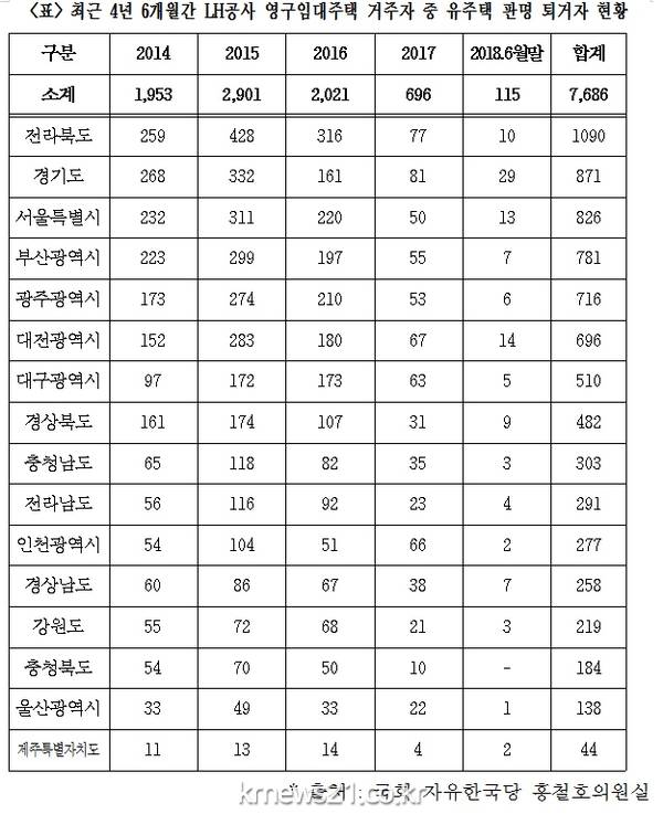 홍철호의원실의 자료에 따르면 영구임대차 계약기간 중 다른 주택을 소유한 것이 드러나 퇴거한 자(세대주 기준)는 ‘14년 1953명, ‘15년 2901명, ‘16년 2021명, ‘17년 696명, 올해(6월말 기준) 115명 등 최근 4년 6개월간 총 7686명인 것으로 확인됐다.