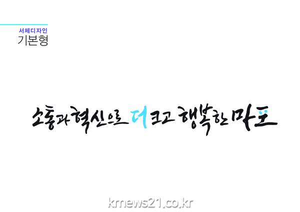 또한, “마포의 마에서 모음 ‘ㅏ’를 아래로 내려쓴 후 다시 힘 있게 올라가는 획의 연결은 남과 북의 연결점으로서 ‘마포’를 상징하고 남북화해 시대의 중심에 마포가 서겠다는 의지를 담았다”고 전했다.