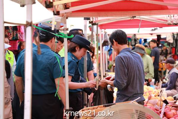 또한 전통시장 경기 활성화를 위해 직접 과일을 구입하며 상인들의 이야기에 적극 공감하는 등 시민과 함께하는 치안정책을 펼치기 위해 노력했다.