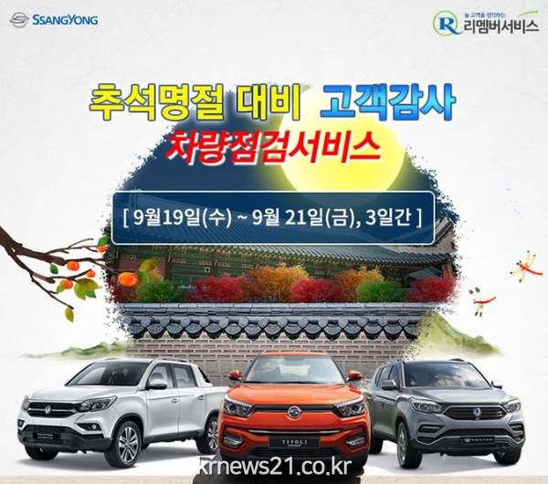 쌍용자동차는 고객들의 추석명절 안전 운행을 위해 ‘추석 특별 무상 점검 서비스’를 실시한다고 18일 밝혔다.