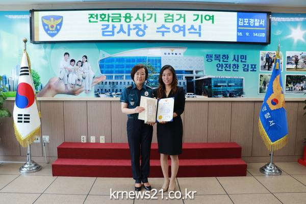 김포경찰서(총경 강복순)는, 2018. 9. 14(금) 김포경찰서에서는 전화 금융사기(보이스피싱) 피해를 막은 우리은행 김포00지점 은행원 임00(40세, 여)에게 감사장과 포상금을 전달했다.