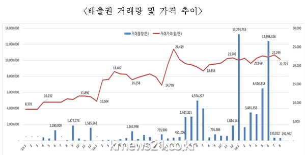 배출권의 톤당 평균 거래가격은 2015년 1만 2,028원에서 2016년 1만 7,367원, 2017년 2만 1,131원으로 증가세를 보였으며, 3년간 평균가격은 2만 374원으로 집계됐다.