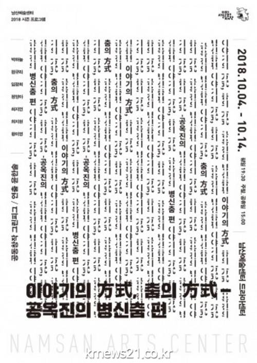 서울문화재단 남산예술센터는 2018년 시즌 프로그램 하반기 두 번째 작품으로 ‘공옥진과 1인창무극’을 탐구하는 연극 <이야기의 方式, 춤의 方式-공옥진의 병신춤 편>(공동창작 그린피그, 연출 윤한솔, 그린피그 공동제작)을 10월 4일(목)부터 14일(일)까지 무대에 올린다.