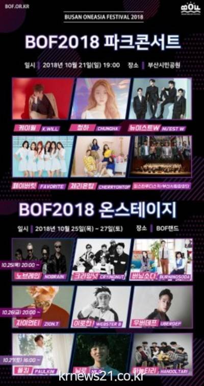 부산시가 주최하고 부산관광공사가 주관하며 문화체육관광부와 한국관광공사가 후원하는 아시아 No.1 한류 페스티벌 ‘BOF2018’은 10월 20일부터 28일까지 부산아시아드주경기장, 부산시민공원, 해운대 구남로 등 부산 전역에서 국내 최정상의 뮤지션과 아티스트들, 다양한 부산발 문화 콘텐츠가 함께 할 예정이다.