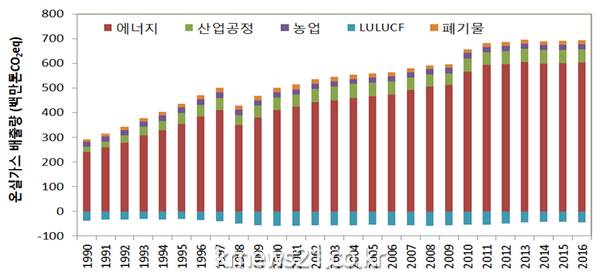 우리나라 온실가스 총배출량은 2013년 6억 9,670만 톤으로 정점을 기록하고 2014년 6억 9,090만 톤으로 다시 낮아진 후, 2015년부터는 소폭의 증가를 보이고 있다.