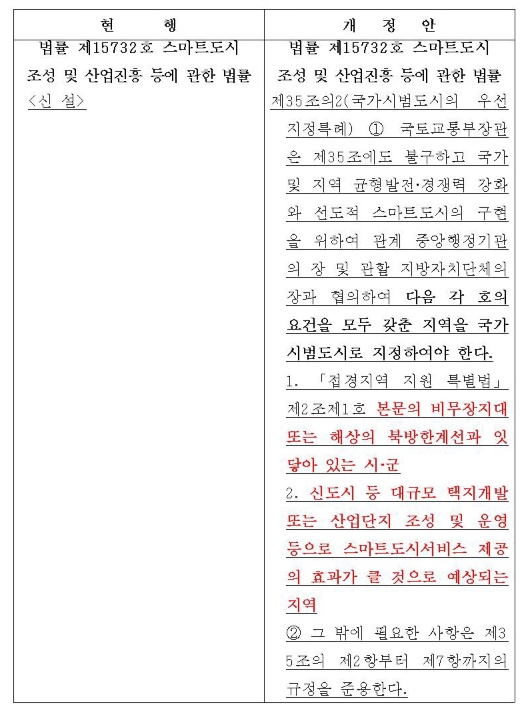 홍철호 의원이 대표발의한 개정안을 보면 국토교통부장관은 국가 및 지역 균형발전·경쟁력 강화와 선도적 스마트도시의 구현을 위하여, 「접경지역지원특별법」 제2조제1호 본문의 비무장지대 또는 해상의 북방한계선과 잇닿아 있는 시·군 중에서, 【신도시 등 대규모 택지개발】 또는 【산업단지 조성 및 운영】 등으로 스마트도시서비스 제공의 효과가 클 것으로 예상되는 지역을 ‘스마트 국가시범도시’로 의무 지정해야 한다.