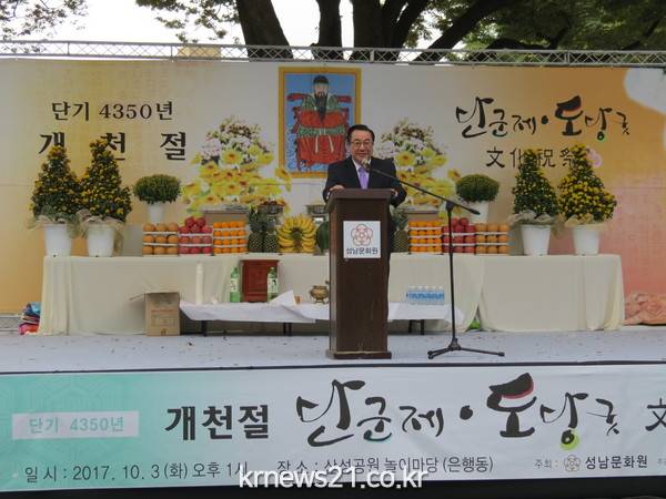 이날 행사는 성남시립 국악단 ‘타악 퍼포먼스’의 식전 공연으로 시작하여 1부 기념식은 성남문화원(원장/김대진)이 개최하며 개천절 노래, 소리 친구회의 ‘배 띄워라, 양산도 밀양 아리랑’이 펼쳐지면서, 단군정신을 계승 발전시켜 민족의 얼을 되새기고 국가의 발전 및 성남시의 번영과 각 가정의 행복을 기원하게 된다.