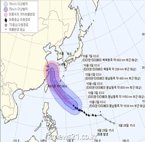 기상청에 따르면 제25호 태풍은 10월 6일경 대만 해역 지나면서 이후 제주는 6일~8일경 태풍 직・간접영향권에 들 것이라고 예상하고 있어 강풍 및 강우에 따른 피해발생이 우려되니 예찰 등 사전대비 필요하다.