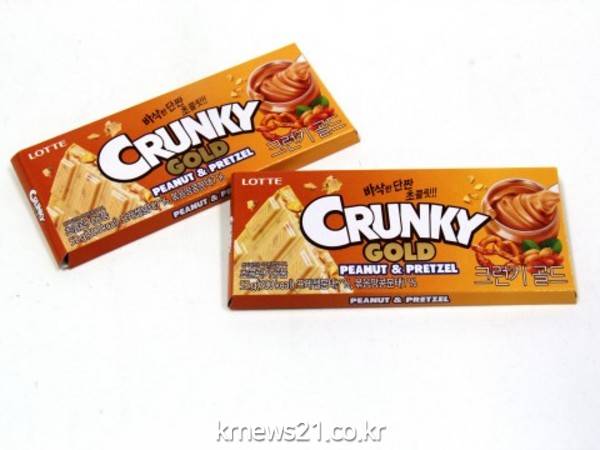 크런키 골드는 기존의 뻥쌀 대신 프레첼과 땅콩을 사용했기 때문에 씹히는 알갱이가 굵직하게 느껴져 씹는 재미가 색다르다. 디자인 또한 갈색의 겉포장지와 금장으로 된 속포장지, 연노랑의 화이트초콜릿까지 전반적인 골드톤의 일체감을 이뤄 제품을 더욱 고급스럽다.