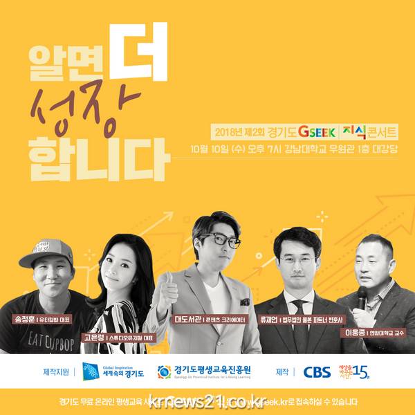 경기도와 경기도평생교육진흥원은 10월 10일 오후 7시 용인 강남대학교 우원관에서 ‘알면 더 성장합니다.’라는 주제로 ‘2018년 제2회 경기도 지식(GSEEK) 콘서트’를 개최한다.