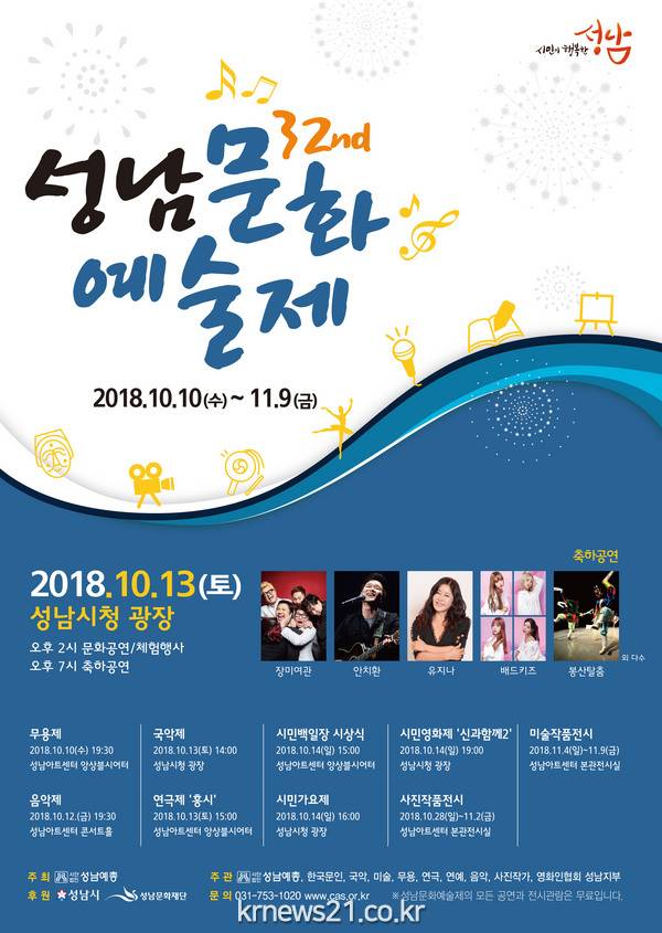 ‘제32회 성남문화예술제’가 오는 10월 10일부터 11월 9일까지 한 달여 기간에 성남시청과 성남아트센터에서 열린다.
