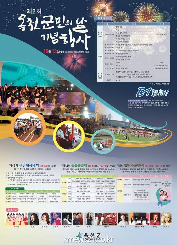 군 관계자는 “지역 발전의 원동력은 군민의 단합된 힘이며, 5만2천여 군민이 화합하고 소통할 수 있는 ‘제2회 군민의 날’ 기념행사에 많이 군민이 찾아 옥천군민의 단합된 힘을 느끼고 돌아가시길 바란다”고 말했다.