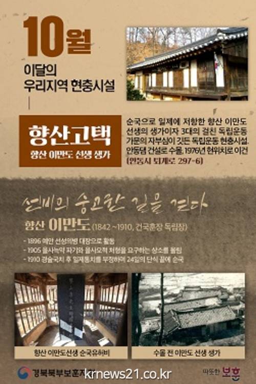 경북북부보훈지청(지청장 김상출)은 ‘2018년 10월‘ 이달의 우리지역 현충시설로 향산고택(경북 안동시 퇴계로 297-6)을 선정했다.