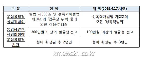 이에 따라 인사처는 공무원 임용결격 및 당연퇴직 사유가 되는 성범죄 범위를 ‘업무상 위력에 의한 간음·추행’에서 ‘모든 유형의 성폭력 범죄’로 확대하고 기준이 되는 벌금형 기준을 종전의 ‘300만원 이상’에서 ‘100만원 이상’으로 높였다.