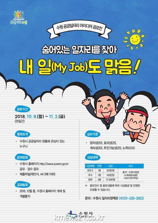 주요 공모 내용은 청년·여성·장애인 등 대상별 공공일자리 창출 방안, 수원 산업·문화 등 지역 맞춤형 일자리 창출 방안, 공공서비스 확충을 위한 일자리 창출 방안, 기존 공공일자리 정책 개선 방안 등이다.