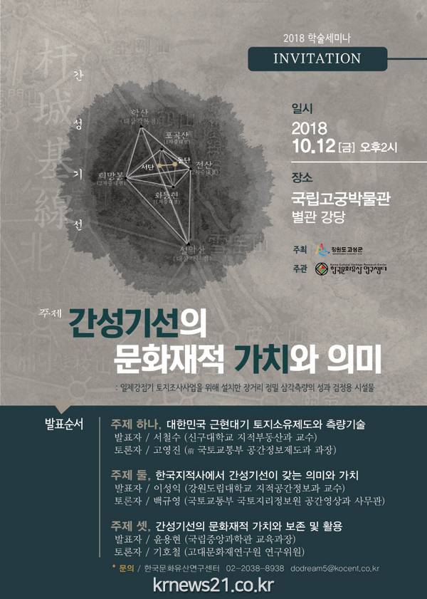 이번 학술세미나는 고성군이 주최하고, 한국문화유산연구센터가 주관하는 행사로, 우리나라 최초의 근대적 측량기선인 간성기선의 의미와 문화재적 가치를 재조명하기 위한 자리이다.