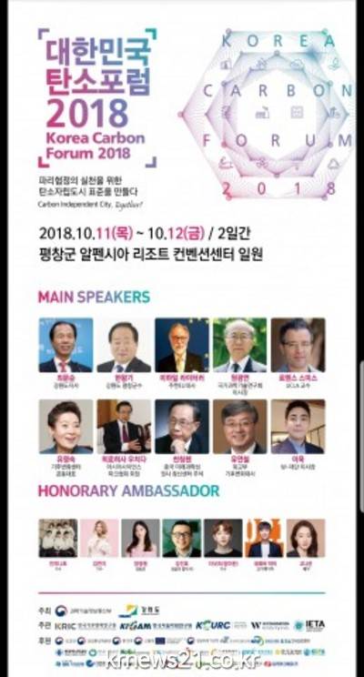 강원도와 과학기술정보통신부가 주최하고 한국기후변화연구원, 한국지질자원연구원, 탄소자원화국가전략프로젝트사업단, W-재단, 국제배출권거래협회(IETA)가 주관하는 ‘대한민국탄소포럼 2018’이 10일부터 12일까지 2일간 평창군 알펜시아 컨벤션센터에서 개최된다.