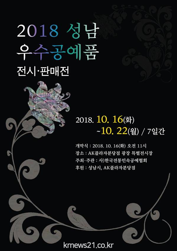 ‘2018. 성남 우수공예품 전시·판매전’이 오는 10월 16일부터 22일까지 분당구 서현동 AK플라자 1층 특별전시장에서 열린다.