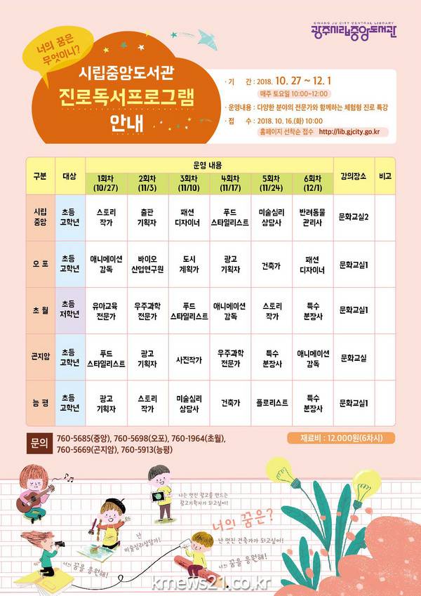 주요 내용으로는 ‘패션 디자이너’, ‘푸드스타일리스트’, ‘반려동물관리사’, ‘바이오 산업연구원’ 등이 있으며 각 관당 초등학교 저학년 또는 고학년 20명씩 모집한다. 수강신청은 광주시립중앙도서관 홈페이지(http://lib.gjcity.go.kr/)를 통해 선착순 모집한다.