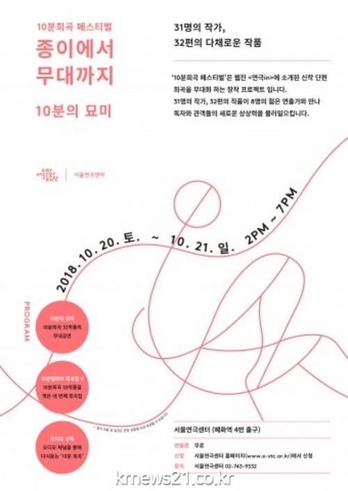 ‘10분희곡 페스티벌’은 연극전문 웹진 ‘연극in’에 게재된 신진작가와 지망생들의 10분짜리 단편 희곡을 무대화하는 단막극 축제다. 올해는 역대 최다 작품이 ‘종이에서 무대까지’라는 타이틀로 무대에 오르며 작가와의 대화, ‘10분희곡’의 현주소를 살펴보는 대담 프로그램 등을 무료로 즐길 수 있도록 구성됐다.