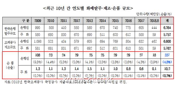 지난 2009년부터 2018년 8월까지 10년간 한국조폐공사에서 제조한 은행권(지폐) 전체 66억장 중 3억 3,700만장 이상이 제조불량으로 소각된 것으로 확인됐다.