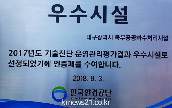 ▲ (사진=대구광역시청)대구환경공단(이사장 강형신) 북부사업소가 한국환경공단에서 실시하는「2017년도 기술진단 완료시설에 대한 운영관리 평가」에서 우수시설로 선정됐다.