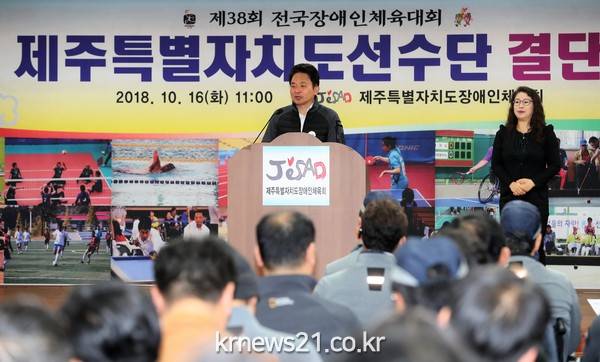 원희룡 제주도지사는 이날 제주시 탐라장애인복지관에서 진행된 ‘제38회 전국체육대회 결단식’에서 이같이 전했다.