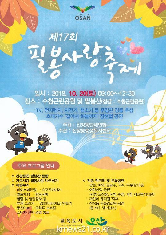 오산시 신장동 단체연합(위원장 김동필)은 오는 20일 수청근린공원과 필봉산 일원에서 「제17회 신장동 필봉사랑축제」를 개최한다고 밝혔다.