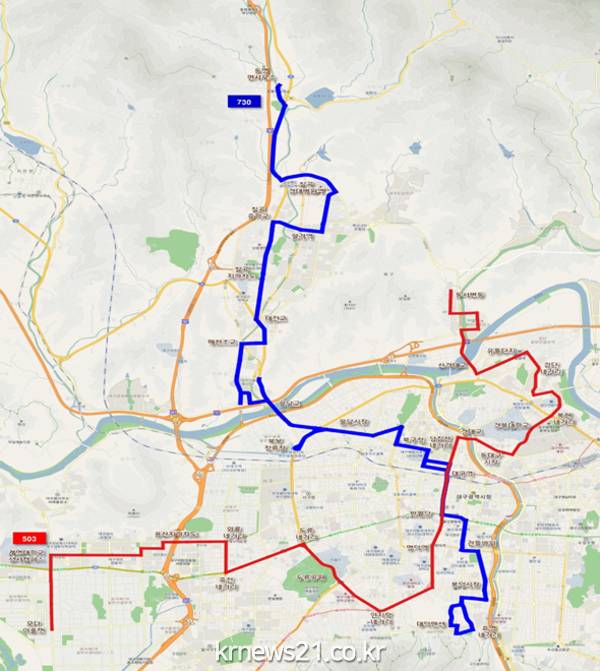 먼저 전기버스 운행노선 503번과 730번 노선의 특징은 평균 1회 충전거리(200㎞ 내외)를 감안한 단거리 노선(편도 30㎞정도)으로서 차고지에 충전시설 설치가 용이하며, 운행 중 대기시간에 충전이 가능하고 시내버스 이용객이 많은 대중교통전용지구를 경유하여 대시민 홍보효과가 높은 노선이다.