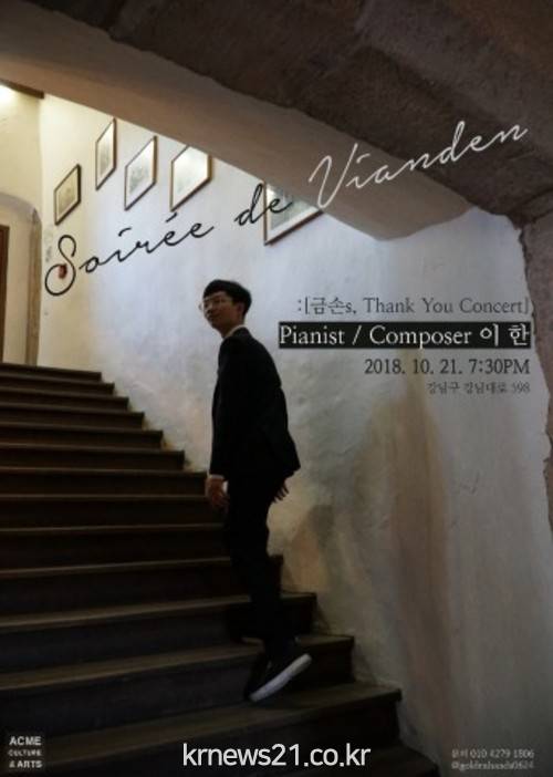 이한과 임하준의 ‘땡큐 콘서트’는 10월 21일(일)과 28일(일) 각각 7시 30분 총 2회에 걸쳐 60분 프로그램으로 진행된다. 21일 이한은 쇼팽, 베토벤의 클래식 레퍼토리를 비롯해 본인이 작곡한 현악4중주곡과 20세기초 폴란드 작곡가 탄스만의 작품을 편곡하여 신선한 무대를 꾸밀 예정이다. 28일 임하준은 슈베르트의 아르페지오네 소나타, 미국의 작곡가 쇤필드가 1986년 작곡한 재즈풍의 Café Music 등을 연주할 예정이다.